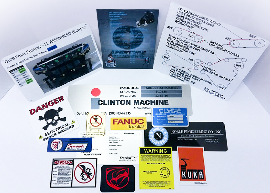 - Industrial nameplates: engraved or printed operating instructions, machine tags, and safety warnings